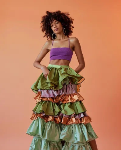 This outfit is bursting with festive flair! The vibrant tiered maxi skirt features layers of green, gold, and purple ruffles perfectly channeling the iconic Mardi Gras color palette. The fitted lilac crop top keeps the look balanced, while strappy purple platform sandals and oversized hoop earrings complete this bold and playful ensemble.