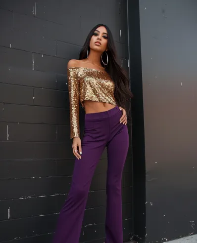 This look strikes the perfect balance between glam and sleek. The off-the-shoulder gold sequin crop top shimmers beautifully under the light, making it a true showstopper. It s paired with high-waisted, tailored purple trousers that add structure and sophistication. The metallic gold heels tie the look together, while oversized hoop earrings give it a playful touch.