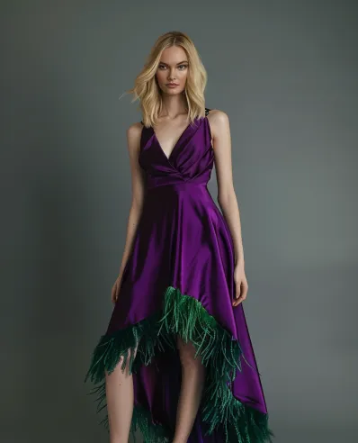 This stunning high-low gown is the perfect blend of elegance and flair. The deep purple satin fabric drapes beautifully, creating a flattering silhouette with a plunging neckline and a fitted waist. The hemline is adorned with bold green feather trim that adds movement and a festive touch. Paired with metallic strappy heels and delicate jewelry, this dress is ideal for a glamorous Mardi Gras celebration.