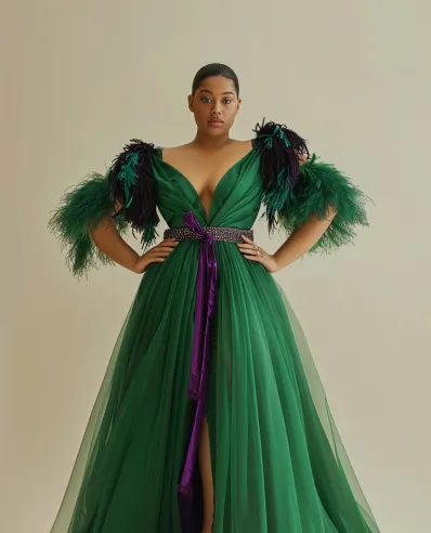 This emerald green gown is the definition of drama and elegance. The deep V-neckline and cinched waist create a flattering silhouette, while the flowing tulle skirt gives it a regal, almost fairy-tale vibe. The standout feature has to be the voluminous feathered shoulders, mixing green and purple hues to perfectly channel the festive spirit of Mardi Gras. A jeweled belt and a purple satin sash add an extra touch of glamour. Paired with sparkly heels, this look is made for grand entrances.