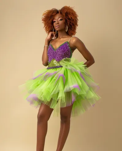 This playful mini dress is all about celebrating the festive spirit of Mardi Gras! The top is encrusted with shimmering purple crystals, while the skirt bursts with layers of neon green and lavender tulle. A wide, glittery waistband cinches the waist, creating an hourglass silhouette. Paired with gold hoop earrings and metallic strappy heels, this outfit radiates party energy from head to toe.