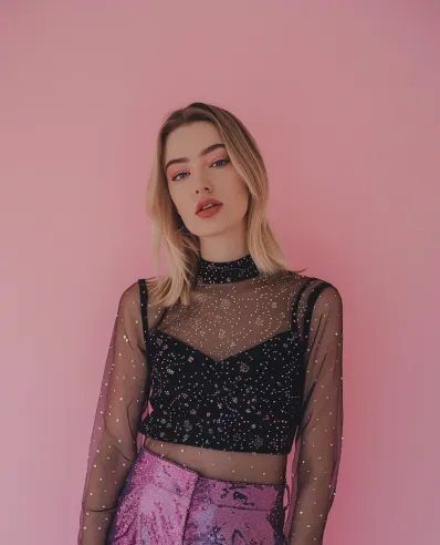 This outfit is a perfect mix of edgy and glam! The black sheer top is sprinkled with tiny sparkles, giving it a celestial, starry-night vibe. Beneath it, a fitted black crop adds a subtle layer, balancing the boldness. The real showstopper is the high-waisted, hot pink sequin pants bright, bold, and absolutely dazzling. Paired with soft, glowing makeup and a confident attitude, this look is ideal for a Mardi Gras night full of fun and excitement.