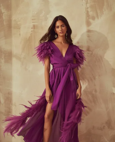 This gown is giving all the drama and glamour! It’s a rich, royal purple with a deep V-neckline and a flowing silhouette that s cinched beautifully at the waist with a sash. But let s talk about those feathered shoulder and skirt details they’re like something out of a fashion fantasy. The thigh-high slit adds a touch of flirtiness, showing just the right amount of leg. Paired with metallic strappy heels and statement earrings, it s a look that screams queen of the Mardi Gras ball.