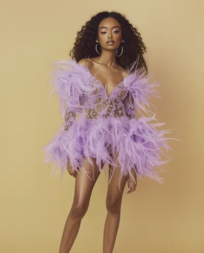 This mini dress is pure drama in the best way possible! A plunging neckline and sheer, crystal-encrusted fabric create a striking base, but it’s the explosion of lavender feathers that truly steals the show. The feathers add volume, movement, and a whimsical vibe perfect for a festive occasion like Mardi Gras. Paired with metallic heels, large hoop earrings, and bold makeup, this outfit commands attention.