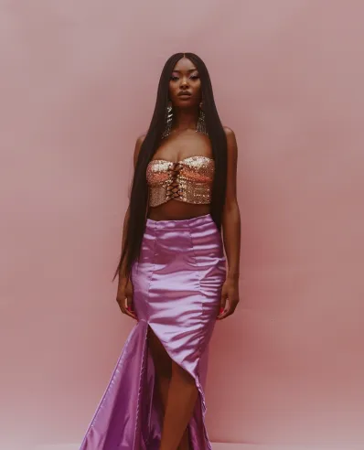 This outfit is bringing all the glam with a bronze sequin corset top that sparkles from every angle. The top is fitted with lace-up detailing in the center, giving it a playful, sexy vibe. It’s paired with a high-waisted, lilac satin skirt that flows beautifully with a high slit and dramatic train. Add in some glittery heels and statement earrings, and you’ve got yourself a show-stopping ensemble ready for any Mardi Gras festivity.
