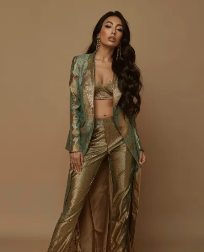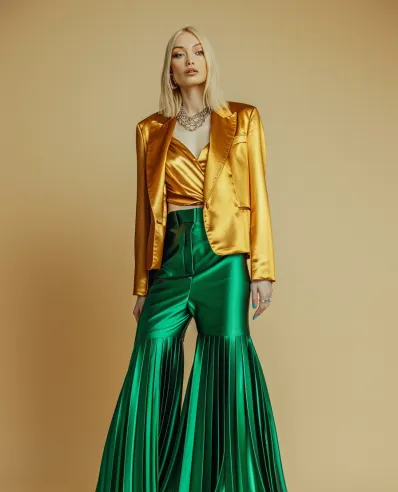 This outfit is all about making a bold statement! The golden satin blazer and matching wrap-style top create a luxurious, eye-catching combo. Meanwhile, the emerald green satin pants feature dramatic pleated flares that add tons of movement and elegance. Styled with shimmering heels, layered necklaces, and bold rings, this look perfectly balances festive glamour with high-fashion vibes.