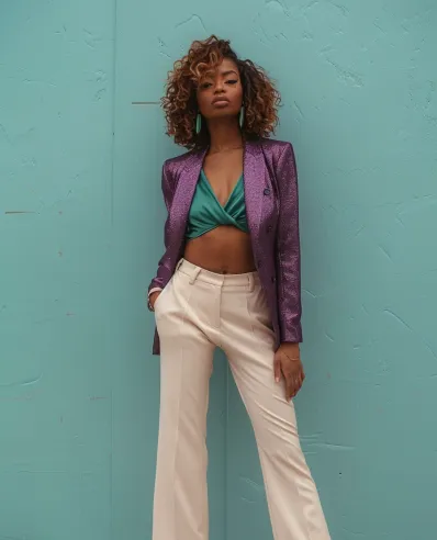 This outfit strikes the perfect balance between sophisticated and playful. A shimmering purple blazer takes center stage with its sleek, tailored fit. Underneath, a deep emerald green satin crop top adds a pop of bold color and a touch of flirtiness. The high-waisted cream trousers bring in a structured, neutral element, keeping the look polished. Add in strappy nude heels and bold earrings, and you’re all set to make a stylish statement at any Mardi Gras event.