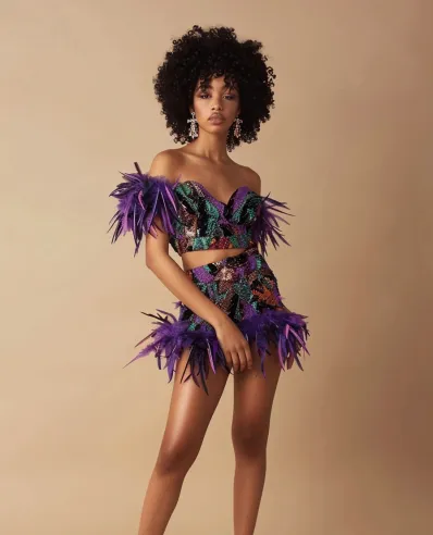 This two-piece set is a bold and festive dream! The off-the-shoulder crop top is covered in dazzling multicolored sequins and accented with striking purple feathered sleeves. The matching high-waisted mini skirt features feathered details along the hem, adding fun movement and flair. Paired with sparkling heels and statement earrings, this look is made for dancing the night away at a Mardi Gras celebration.