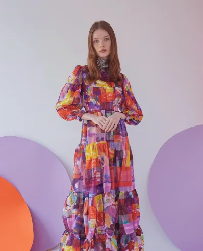 This maxi dress is a kaleidoscope of color and pattern! It features a high neck and long, puffed sleeves, giving it a touch of vintage charm. The tiered skirt adds plenty of volume and flow, while the vibrant mix of purples, pinks, oranges, and yellows makes it impossible not to stand out. Paired with strappy heels and minimal jewelry, this look is perfect for a Mardi Gras celebration filled with color and creativity.
