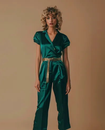 This satin emerald jumpsuit is sleek, chic, and oh-so-stylish. It has a wrap-style top with a sharp collar and puffed sleeves, creating a balance between structured and playful. The cropped pant legs keep it fresh and modern, while a shimmering gold belt adds a festive touch that ties the whole look together. Styled with strappy metallic heels and bold hoop earrings, this outfit is both polished and party-ready for Mardi Gras celebrations.