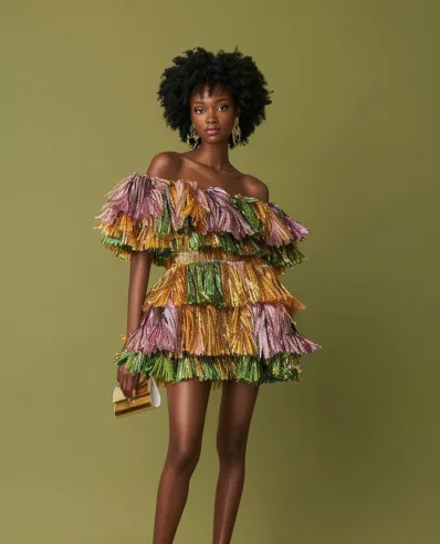 This off-the-shoulder mini dress is pure Mardi Gras magic! Layers of shimmering fringe in purple, green, and gold the signature carnival colors create a playful and eye-catching look. The ruffled tiers add lots of movement, perfect for twirling on the dance floor. Paired with metallic gold ankle boots, statement earrings, and a chic clutch, this outfit radiates party-ready energy.
