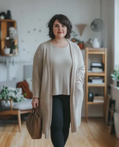 This outfit brings together a long, soft beige cardigan with a loose cream top, creating a cozy yet stylish vibe. Black leggings offer a sleek and comfortable base, while the brown ankle boots add a touch of polish to the overall look. The earthy tones in the cardigan and boots complement each other beautifully, giving the outfit a warm, inviting feel. A small beige handbag completes the ensemble, adding both function and a bit of flair.
