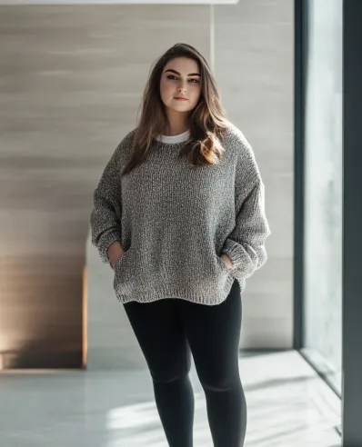 This outfit features an oversized grey knit sweater paired with black leggings for an easygoing, laid-back vibe. The sweater s loose fit and chunky texture make it cozy without being too heavy, while the fitted leggings create a balanced silhouette. White sneakers add a sporty, casual touch to the ensemble, making it perfect for a relaxed first date that involves a bit of walking or activity.