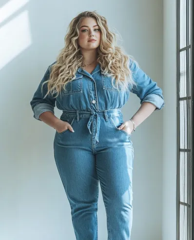 This outfit features a stylish belted denim jumpsuit, combining a relaxed fit with a cinched waist to create a flattering hourglass silhouette. The rolled-up sleeves and cuffs add a casual touch, while the self-tie belt highlights the waist. Paired with crisp white sneakers, this look is comfortable and effortlessly cool, perfect for an easygoing yet trendy first date vibe.