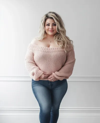 This outfit highlights a beautiful blush pink off-shoulder sweater paired with mid-rise blue skinny jeans. The sweater s chunky knit and off-shoulder design add a touch of flirty charm, while the light pink shade keeps it soft and feminine. Paired with fitted blue jeans, the look is balanced and flattering, showing off the right curves while keeping things cozy. The nude ankle boots finish off the outfit with a polished touch, adding a bit of height and complementing the soft tones.