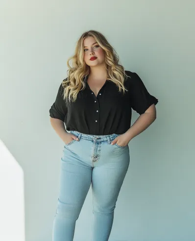 This outfit pairs a relaxed-fit black button-up shirt with light-wash, high-waisted jeans for a timeless and laid-back look. The shirt s rolled-up sleeves give it an easygoing feel, while the high-rise jeans offer a flattering fit that defines the waist. The look is finished off with clean white sneakers, adding a fresh, casual touch to the ensemble.