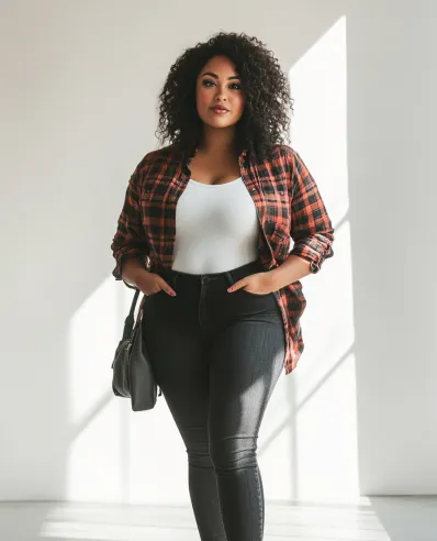 This outfit pairs a white tank top with a classic red and black plaid shirt, giving off a relaxed, effortlessly cool vibe. The plaid shirt is worn open for a laid-back feel, with its rolled-up sleeves adding a hint of casual chic. High-waisted black skinny jeans provide a flattering fit, and the dark brown ankle boots give a stylish finish. The look is completed with a simple crossbody bag, making it practical without sacrificing style.