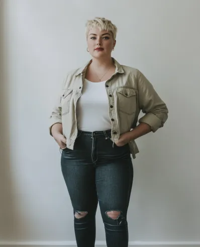 This outfit blends an open utility jacket in a soft beige with a fitted white tank top, creating a simple yet edgy feel. The dark skinny jeans with distressed details at the knees add a bit of attitude to the look, while the cropped jacket provides structure and balance. Paired with olive green ankle boots, this outfit has a cool, laid-back vibe that s perfect for a first date with a touch of adventure.