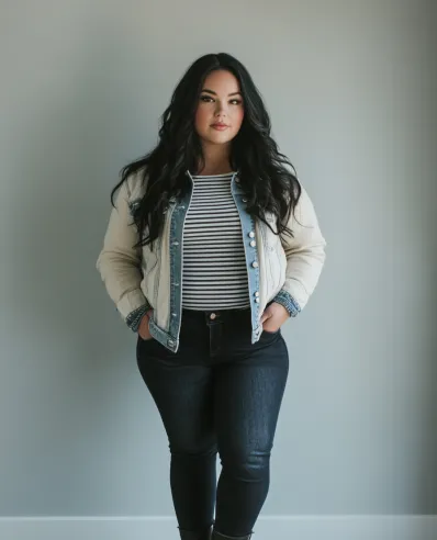 This outfit combines a striped, fitted top with dark wash skinny jeans for a timeless casual vibe. It s topped off with a cozy denim-accented jacket in a soft cream shade, giving just the right amount of contrast to the darker jeans. The ensemble is completed with sturdy black lace-up boots, adding an extra touch of edge to the look. The fit of the jacket gently accentuates the waistline, creating a flattering silhouette that feels both relaxed and put-together.
