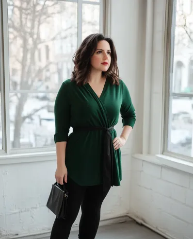 This outfit centers around a wrap-style emerald green blouse that s cinched at the waist with a contrasting black belt, creating a flattering and elegant silhouette. The top is paired with fitted black leggings, which help elongate the legs and keep the look polished. Black heeled ankle boots and a matching black clutch complete the outfit, adding a touch of sophistication.