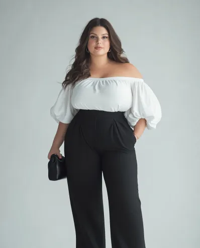 This outfit combines an elegant off-shoulder white blouse with flowing black wide-leg pants for a look that s both chic and comfortable. The blouse features dramatic puff sleeves and a neckline that shows off the shoulders, adding a flirty yet classy touch. The high-waisted black pants create a flattering silhouette, elongating the legs and defining the waist. A pair of black heels and a small black clutch finish off the look, giving it a refined and polished feel.