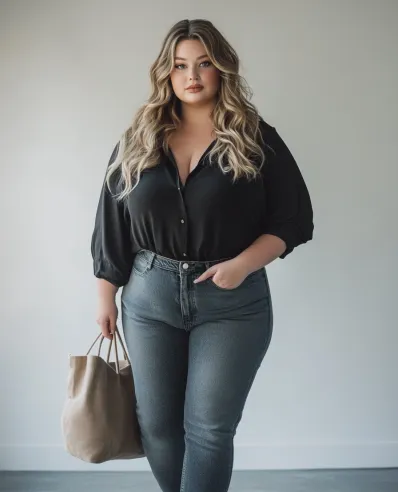 What s not to love about this look? I m a big fan of how the flowy black blouse contrasts with the fitted jeans it gives the outfit such a modern silhouette without trying too hard. Plus, the grey jeans add a nice twist to the usual black-on-black look, keeping it fresh. And that tote bag? It s big enough to carry everything you need without feeling fussy. Whether it s a brunch date or an afternoon exploring the city, this look nails the effortlessly put-together” vibe perfectly!