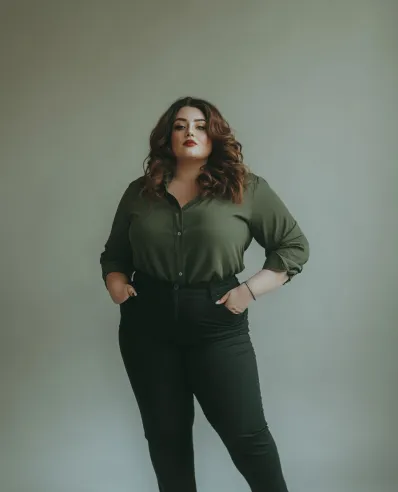 This outfit features an olive-green button-up blouse paired with high-waisted black pants for a polished yet relaxed feel. The blouse’s soft fabric and roll-up sleeves make it look comfortable while still adding a touch of sophistication. The high-waisted pants create a clean line that defines the waist and elongates the legs, and they re matched with classic black heeled pumps that add just the right amount of lift without sacrificing comfort.