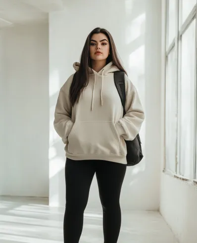 This outfit keeps things laid-back and sporty with an oversized beige hoodie paired with classic black leggings. The hoodie s relaxed fit and soft fabric make it perfect for a cozy and casual date, while the fitted leggings create a sleek and balanced silhouette. Black chunky boots add an edgy touch and provide practicality for walking around. A simple black backpack finishes the look, making it both functional and stylish.