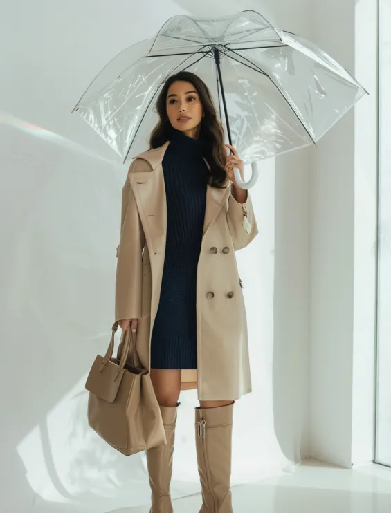 A classic beige trench coat never goes out of style, and this one is tailored to perfection. The structured shoulders and double-breasted design give it an effortlessly polished feel, making it the perfect layering piece. Underneath, a navy knit turtleneck dress adds a chic contrast, hugging the silhouette while keeping things cozy. Knee-high beige boots elevate the look, while a structured handbag in a matching neutral tone ties everything together. The clear umbrella adds a modern, fashion-forward touch, proving that rainy days can still be runway-worthy.