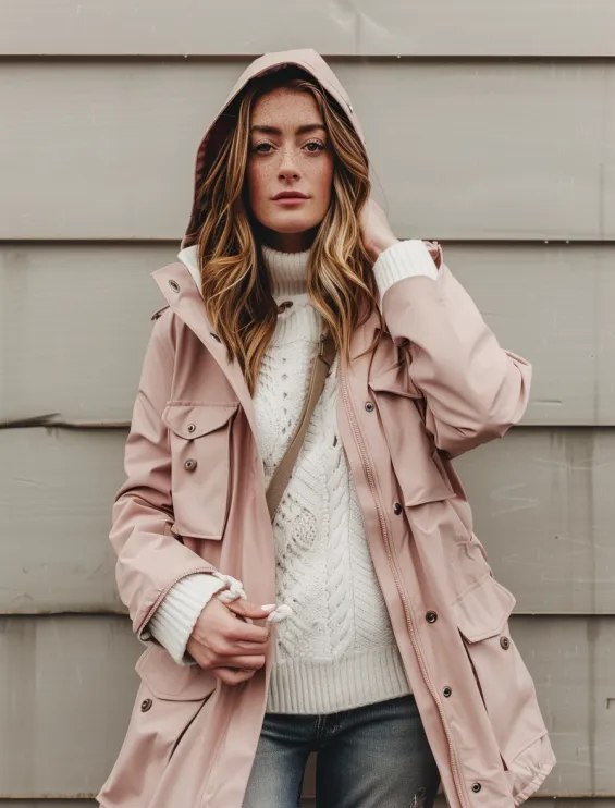 A blush-toned raincoat with a relaxed fit makes rainy days feel effortlessly stylish. The hooded design adds practicality, while the oversized pockets bring a casual, utilitarian vibe. Layered underneath, a chunky cream cable-knit sweater keeps things warm and cozy, adding the perfect amount of texture. Lightly distressed jeans give the outfit a laid-back touch, while a crossbody bag in a neutral tone keeps it functional and fuss-free.