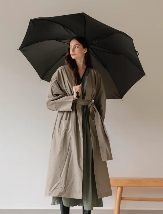 A loose-fitting taupe trench coat is the perfect piece for layering on drizzly spring days. The belted waist keeps the silhouette defined while allowing for a relaxed, effortless vibe. Underneath, an elegant olive green dress adds a soft, flowy touch that complements the muted tones of the coat. Practical black rain boots ensure both comfort and dryness, while a large black umbrella adds a touch of drama to this beautifully understated look.