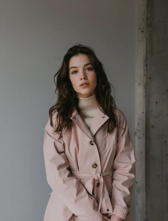 A blush pink raincoat adds the perfect touch of softness to any rainy-day outfit. The belted waist gives a flattering shape, while the structured collar and tortoiseshell buttons keep it polished. Underneath, a cream turtleneck sweater peeks through, adding a cozy contrast that feels effortlessly chic. This pastel-toned look is ideal for those drizzly spring mornings when you want to stay warm and dry without sacrificing style.