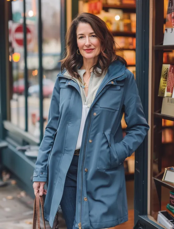 This is the kind of outfit that makes rainy days feel like an opportunity rather than an inconvenience. The blue jacket is practical but still stylish enough for a casual coffee date or a cozy bookstore browse. I love how it pairs so naturally with denim and neutrals it s the kind of go-to look that never fails. Plus, those rain boots mean you can splash through puddles without a second thought.