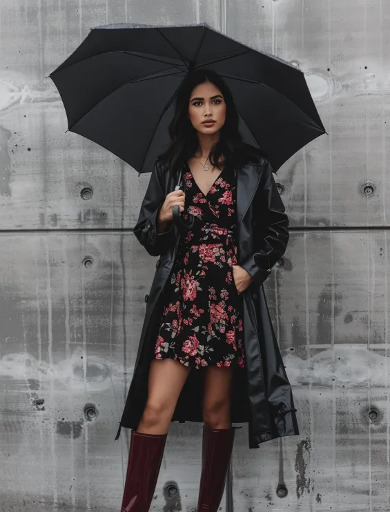 A rainy day doesn t mean ditching florals. This outfit brings together a feminine black floral dress with an unexpected edge a glossy black trench coat. The contrast between the soft, romantic print and the structured coat makes this look effortlessly cool. Burgundy knee-high rain boots add a bold pop of color while keeping feet dry and stylish. A simple black umbrella completes the vibe, making rainy streets feel like a runway.