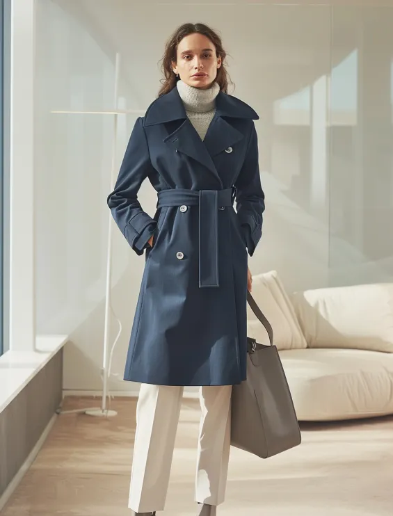 A tailored navy trench coat instantly elevates any rainy-day outfit, and this one is no exception. The belted waist creates a structured, flattering silhouette, while the double-breasted design keeps things classic. Underneath, a soft cream turtleneck adds warmth and a touch of contrast. Crisp white trousers bring a fresh, refined feel, and sleek gray ankle boots tie everything together with modern elegance. A structured tote bag in a matching gray hue finishes off this effortlessly chic look.