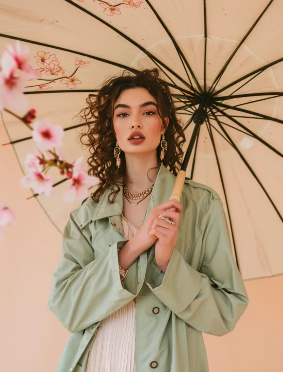 A soft mint green raincoat brings a fresh and romantic feel to this rainy-day look. The relaxed fit keeps it effortlessly chic, while gold buttons add a subtle touch of elegance. Underneath, a flowing pleated dress in blush pink complements the pastel tones, creating a dreamy, feminine silhouette. Statement jewelry, delicate curls, and a beautifully detailed umbrella complete the look, turning a gray day into a fashion moment.