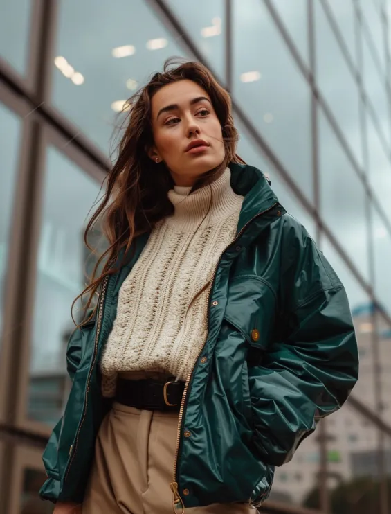 A deep green rain jacket with a glossy finish adds a sporty yet stylish vibe to this rainy-day outfit. The relaxed fit makes layering effortless, while gold hardware details elevate the look just enough. Underneath, a chunky cream cable-knit turtleneck keeps things warm and cozy, contrasting beautifully against the sleek outerwear. Tailored beige trousers and a black belt bring a polished touch, making this outfit feel both put-together and practical.