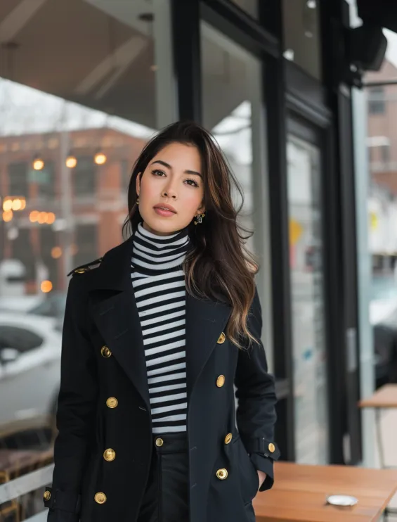 This look is everything chic, sophisticated, and a little bit bold. I love how the striped turtleneck brings a playful contrast to the classic trench, making it feel fresh and modern. The gold accents add just the right amount of elegance, proving that rainy-day dressing doesn t have to be boring. Honestly, if there was ever a look that could make you feel like you re strolling through the streets of Paris (even if it s just to grab coffee), this is it.