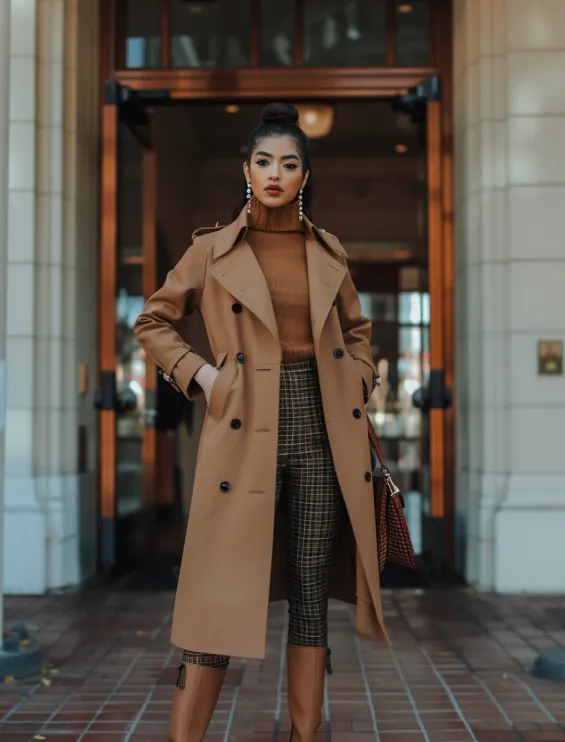 A classic camel trench coat sets the tone for this powerful rainy-day look. The structured fit, sharp lapels, and black button details make it a timeless staple, while a warm brown turtleneck adds depth and richness. Tailored plaid trousers bring a touch of vintage charm, keeping the outfit polished yet dynamic. Knee-high leather boots in a matching camel shade elongate the silhouette, while a structured handbag completes the ensemble with a sophisticated edge.