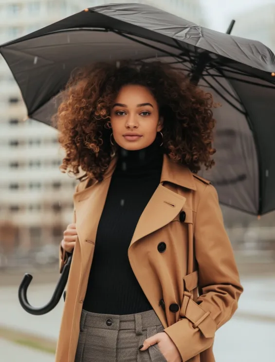 A camel trench coat is the definition of timeless, and this one delivers all the sophistication with a modern edge. The structured fit, double-breasted buttons, and belted waist keep things polished while still feeling effortless. Underneath, a sleek black turtleneck adds a chic contrast, perfectly complemented by tailored gray trousers that bring a refined touch. A black umbrella ties everything together, making this the ultimate city-ready rainy-day outfit.