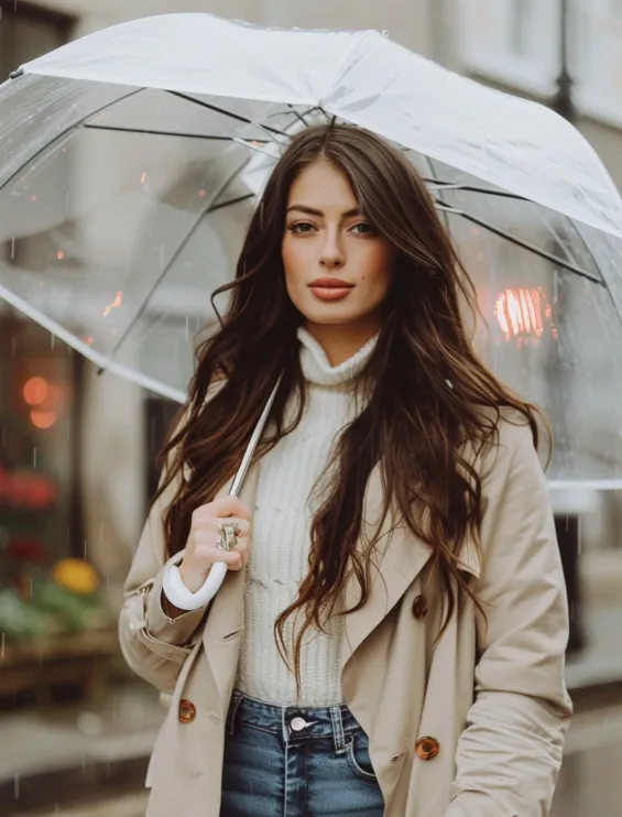 A timeless beige trench coat layered over a cozy cream turtleneck sweater makes this the ultimate rainy-day outfit. The relaxed fit of the coat adds effortless sophistication, while the chunky knit keeps things warm and comfortable. Paired with high-waisted blue jeans, this look strikes the perfect balance between casual and chic. A structured black handbag and a clear umbrella add stylish finishing touches, making rainy streets feel like a fashion runway.