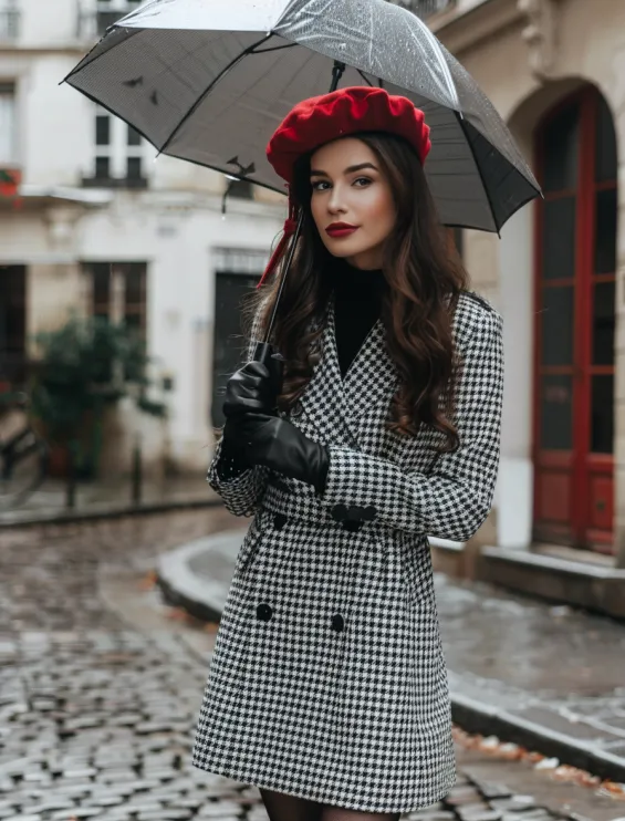 A tailored houndstooth coat brings instant elegance to a rainy day, with its structured double-breasted design giving it that timeless, polished feel. Worn over a sleek black turtleneck, it creates a classic monochrome base, allowing the accessories to steal the show. A bold red beret adds a pop of color, bringing a playful yet sophisticated Parisian touch. Black leather gloves and knee-high rain boots complete the look, keeping both style and practicality in check.