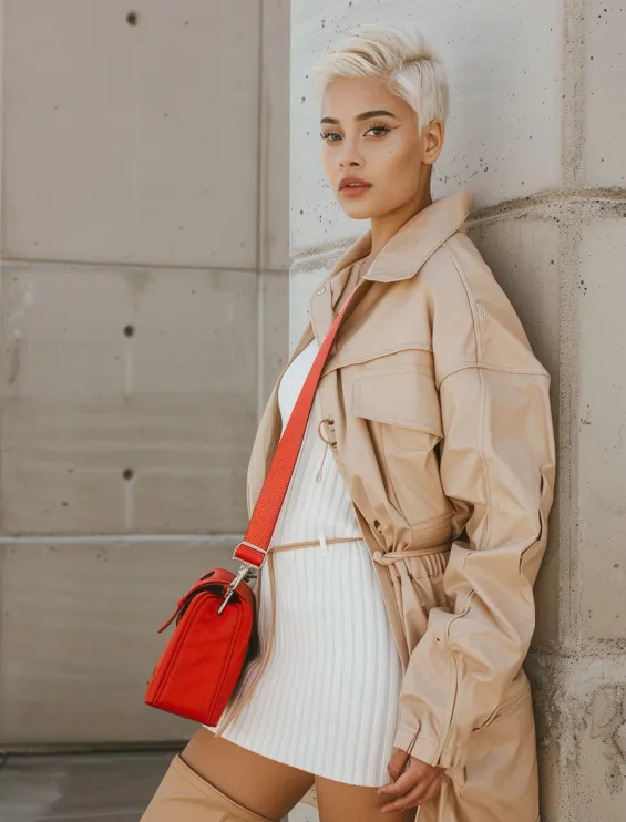 A beige oversized raincoat gives this outfit a sleek, modern feel while keeping things lightweight and practical for unpredictable spring showers. Underneath, a fitted white ribbed dress adds a chic contrast, keeping the silhouette fresh and feminine. The real showstopper? Knee-high beige boots that elongate the look and add a polished, fashion-forward edge. To break up the neutral tones, a bright red crossbody bag brings a bold, unexpected pop of color, making this outfit feel anything but ordinary.