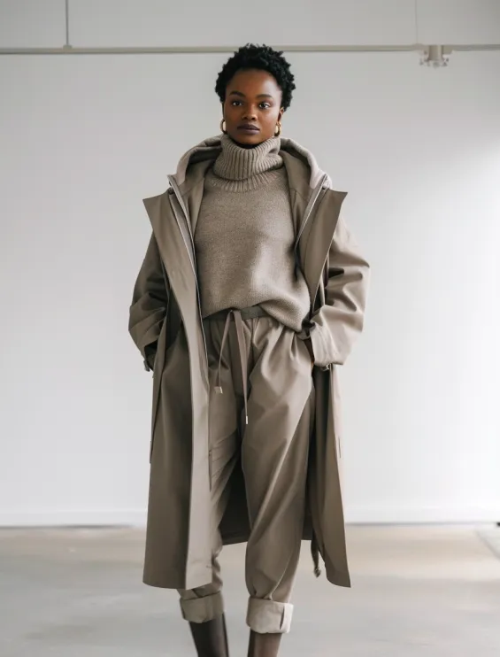 A long, structured raincoat in a warm taupe shade sets the tone for this sleek, monochrome outfit. The oversized fit adds a relaxed, modern feel, while the lightweight material makes it ideal for unpredictable spring showers. A chunky turtleneck sweater in a matching hue keeps things cozy without being bulky, effortlessly tucked into high-waisted joggers for a laid-back yet polished look. Sturdy brown rain boots complete the ensemble, ensuring practicality without compromising style.