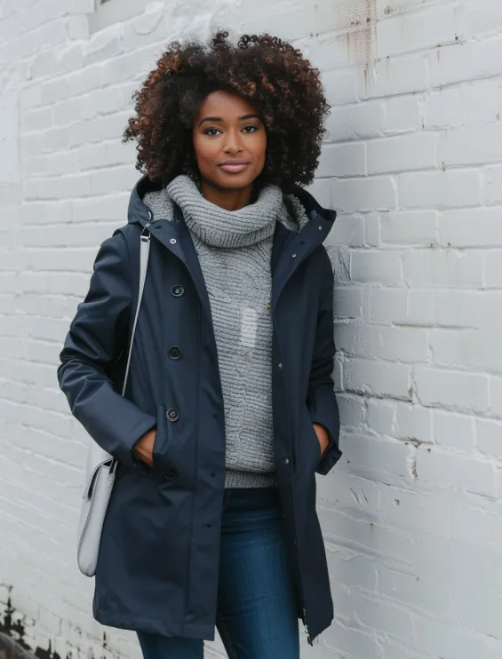 Navy Raincoat and Cozy Knit Layers for Effortless Chic