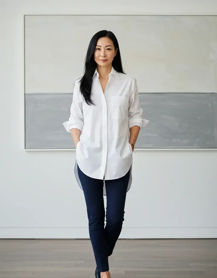 This outfit is a total win if you love minimal style with maximum impact. She’s wearing sleek navy leggings that create a clean silhouette, paired with a crisp oversized white button-down shirt that s been casually cuffed at the sleeves. The navy loafers pull the whole look together and give it that polished, smart feel without going full business mode.