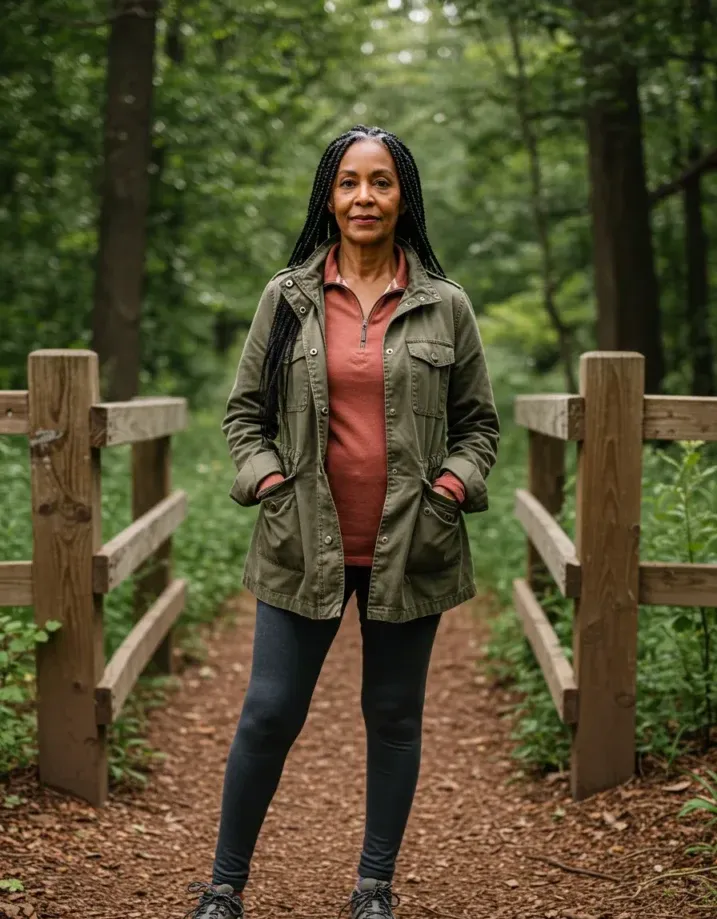 This look is giving practical, powerful, and ready-for-anything vibes. She’s rocking dark grey leggings that move easily with the body, paired with a dusty rose quarter-zip pullover that adds a lovely soft color contrast. On top, a classic olive utility jacket brings that structured, outdoor charm. The sturdy hiking shoes tie it all together for a look that says I came to conquer this trail and look great doing it.”