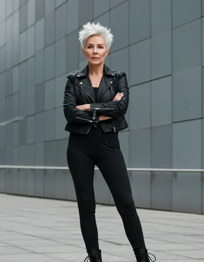 What I adore about this look is how fearless it feels. It s not trying to be soft or subtle it owns the room. The leather jacket adds structure while the leggings keep it sleek, and the boots just seal the deal. Honestly, this outfit makes me want to strut down the street like it s a runway. It s proof that edgy style doesn t have an age limit it just gets better.