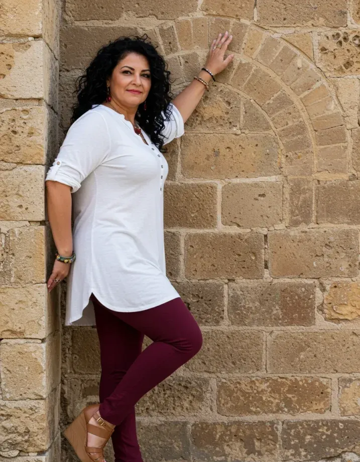 This outfit is effortlessly stylish with just the right amount of flair. She s wearing rich burgundy leggings paired with a crisp white tunic that features rolled sleeves and a flattering henley neckline. The look is elevated with tan wedge sandals that give some height without sacrificing comfort, and her accessories bring in warm earthy tones that pull everything together beautifully.