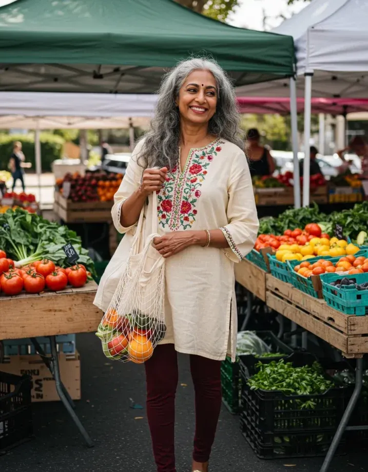 This outfit is all about casual elegance with a boho twist. She s wearing deep burgundy leggings that give structure and color without overwhelming the look. The star piece is that cream tunic with vibrant floral embroidery, which adds a lovely artisanal feel. Paired with comfy gold sandals and a simple market tote, this look is perfect for a sunny day out gathering fresh veggies or just enjoying the buzz of a farmer s market.